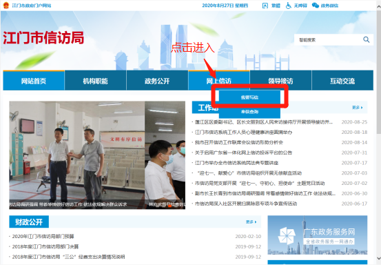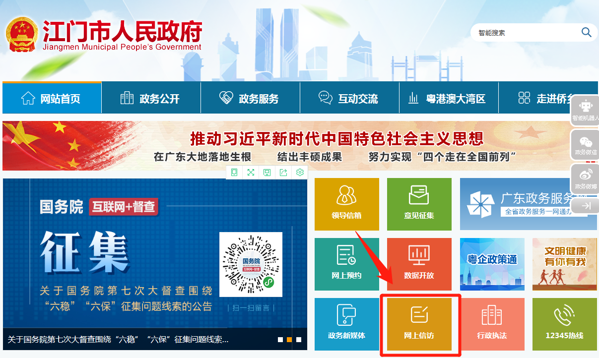 ①点击江门市政府门户网站首页“网上信访”进入“江门市网上信访投诉平台”;