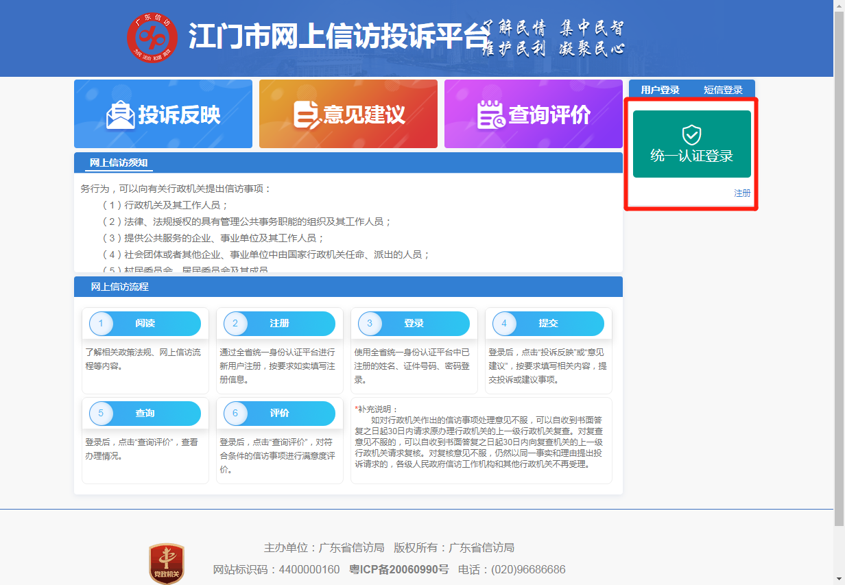 步骤二进入“江门市网上信访投诉平台”页面后,点击右方“统一认证登录”按钮,进行账户登录。