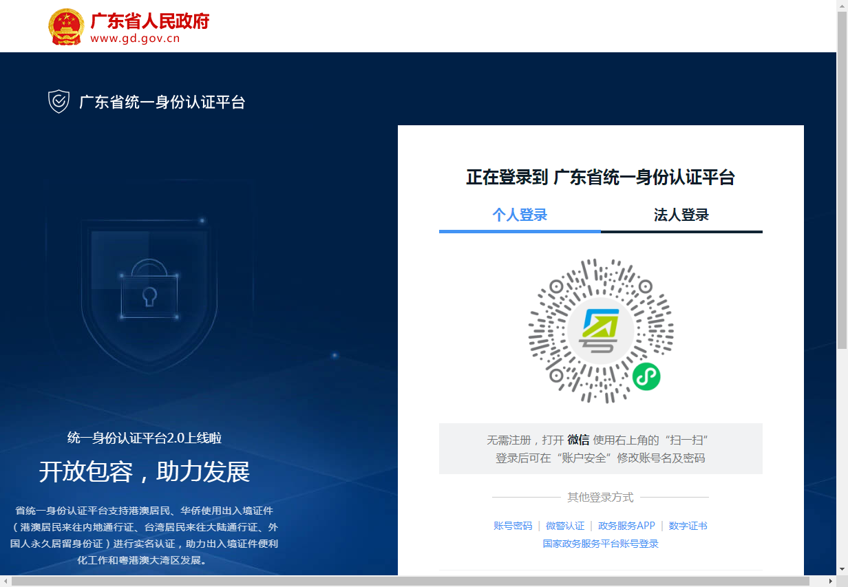 步骤三 进入“登录注册”页面后,如您第一次登录,请选择“立即注册”,进入“广东省统一身份认证平台”进行身份认证;如您属于已注册用户,请选择“统一认证登录”或“使用手机验证码登录”。