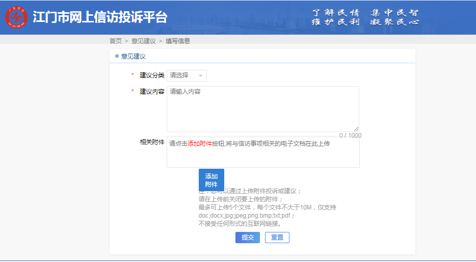 ②进入“我要建议”页面后,填写意见建议时,第一步选择“建议分类”,请您根据实际情况认真选择,这有利于我们准确的甄别您的诉求,转交给有关部门及时处理;第二步在“建议内容”栏填写您需要反映的内容,内容填写不超过1000字,如您反映的具体内容比较多,或者有图片等依据材料,您可选择“添加附件”,将有关依据添加到附件栏,此处单个附件不得超过10M,最多只能添加5个附件;第三步您填写完所有信息,确认无误后点击“提交”即可完成您的操作。