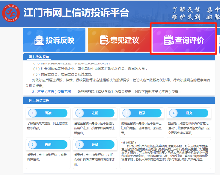 如您的诉求属于2020年7月28日0:00之后通过“江门市网上信访投诉平台”提交的,请点击网站上方的“查询评价”进行查询。