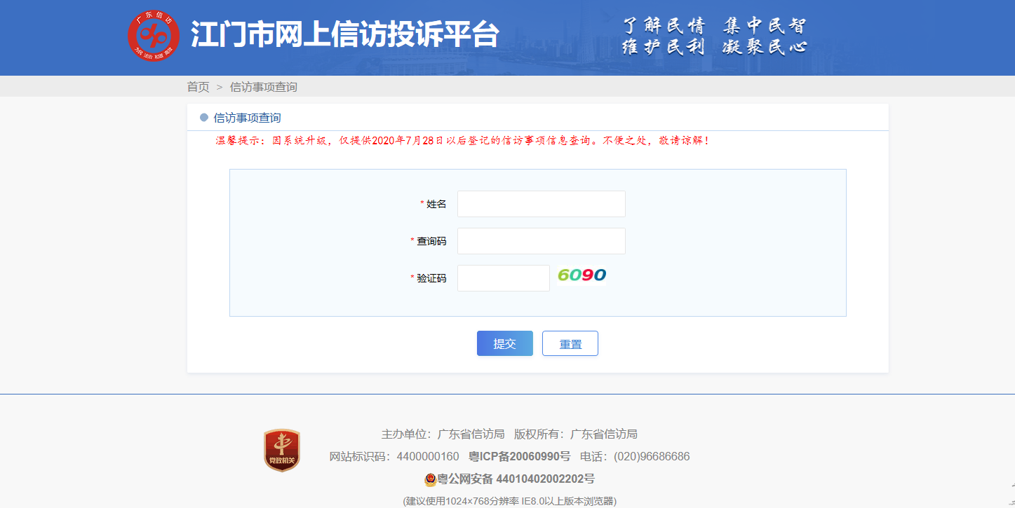 根据广东省信访局的统一部署和要求,江门市信访局已于7月28日起正式启用全省统一的投诉平台“江门市网上投诉平台”。对于群众通过江门市信访局网站或微信公众号提交的诉求,将分不同渠道进行查询。