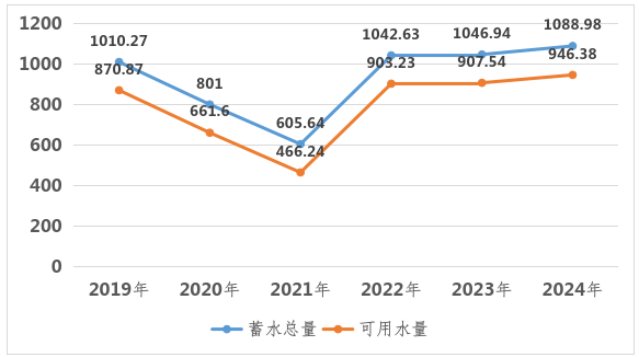 表2 2019-2024年江门10月1日34宗大中型水库库容统计(百万方)