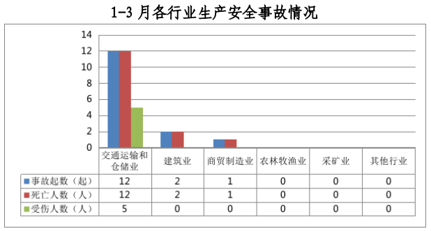 全市共发生生产安全事故15起,其中交通运输和仓储业12起、占80%,建筑业2起、占13%,商贸制造业1起、占7%。农林牧渔业、采矿业和其他行业未发生生产安全事故。