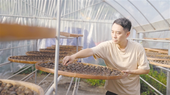在江门创业的香港籍青年梁伟钊在晒制小青柑茶。