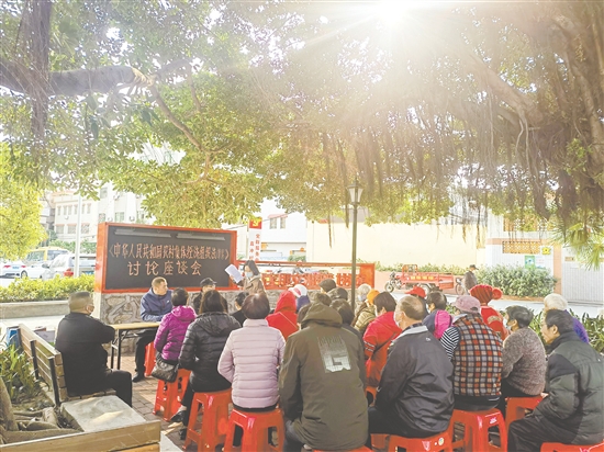 江海区外海街道直冲村召开“榕树下议事会”,讨论农村集体经济组织法(草案)。