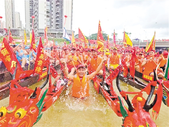 说到江门的龙舟文化,必然要说到棠下龙舟。在今年6月10日举行的2024年棠下端午龙舟会中,27艘棠下龙舟和1艘凤艇共聚天沙河,上演了一场闹端阳的热闹景象。今年的蓬江棠下端午龙舟会为期3天,其间举办了龙舟庙会、市民游龙体验活动、龙舟潮玩集市、龙船饭宴等一系列文旅活动,让众多乡亲以及远道而来的游客朋友热热闹闹过端午。