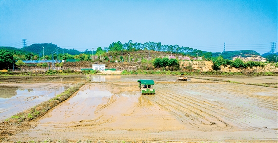 松土机、插秧机在集中连片的水田里来回穿梭。