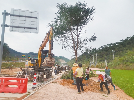 赤溪镇组织工作人员在黄茅海跨海通道赤溪西出口种植绿化树。