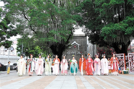 江门日报讯 (记者/罗霈) 穿汉服、祭花神、游老街区……近期,一群又一群身着曲裾、齐胸襦裙、褙子、马面裙等不同形式汉服的佳人,现身蓬江区启明里广场,享受沉浸式古风体验,共度花朝节。