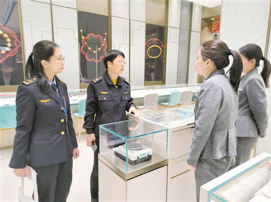 针对计量器具,市场监管执法人员与黄金饰品店经营人员进行沟通。